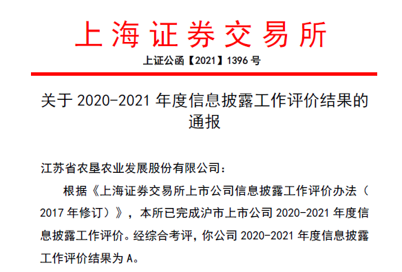 日前,上海證券交易所公布滬市主板上市公司2020-2021年度信息披露工作評價(jià)結(jié)果,蘇墾農(nóng)發(fā)(股票代碼:601952)獲評最高等級“A”級,是蘇墾農(nóng)發(fā)上市以來連續(xù)第二年獲得信息披露工作最高評級。