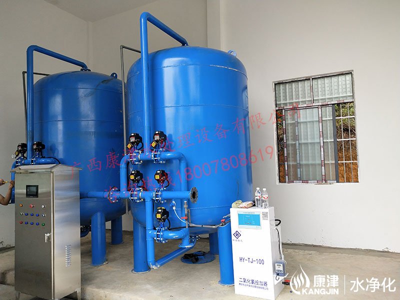 項目名稱:貴港六桂河水凈化工程 設(shè)備名稱:30噸壓力式凈水設(shè)備 工藝流程:河水-石英砂過濾器(二級過濾)-二氧化氯消毒...