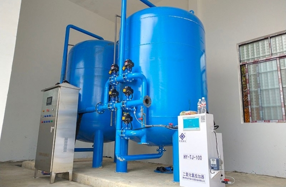 工藝流程:河水-石英砂過濾器(二級過濾)-二氧化氯消毒