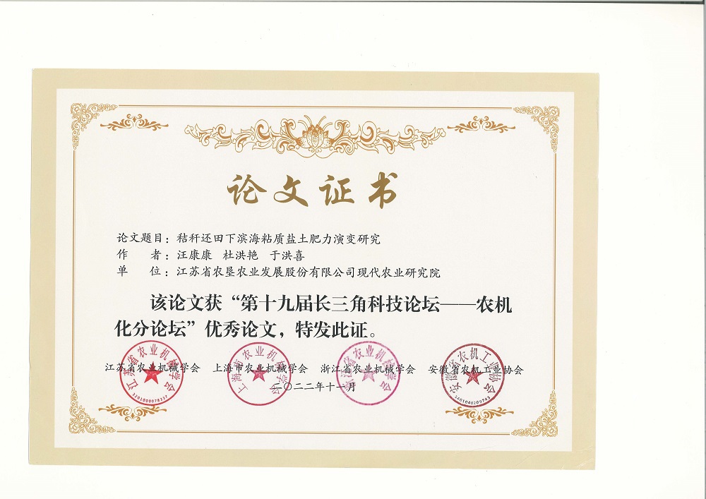 本次論壇共收錄論文47篇,經(jīng)“三省一市”學(xué)(協(xié))會推薦、評審,共評出優(yōu)秀論文13篇,其中江蘇省5篇。蘇墾農(nóng)科院首次參加該獎評選,報評的2篇論文都獲得優(yōu)秀論文獎榮譽,這是蘇墾農(nóng)科院多年來潛心農(nóng)機農(nóng)藝相結(jié)合的研究結(jié)果。蘇墾農(nóng)科院將以此次獲獎為契機,持續(xù)加大農(nóng)機農(nóng)藝相融合的科研攻關(guān)力度,為蘇墾農(nóng)發(fā)一體化擴量發(fā)展提供科技支撐。