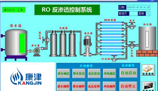 RO反滲透膜的工作原理就是基于以上的反滲透作用。在RO反滲透膜的原水一側(cè)加上一定的電壓,形成膜兩側(cè)的壓力差,膜一側(cè)的高濃度水分子在壓力差的作用下,透過反滲透膜從而達(dá)到過濾凈水的作用。