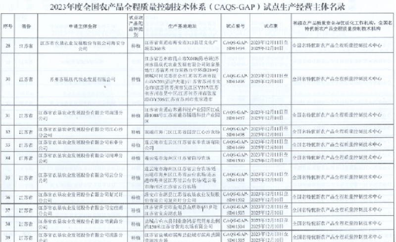 近日,農(nóng)業(yè)農(nóng)村部農(nóng)產(chǎn)品質(zhì)量安全中心公布2023年度全國(guó)農(nóng)產(chǎn)品全程質(zhì)量控制技術(shù)體系(CAQS-GAP)試點(diǎn)生產(chǎn)經(jīng)營(yíng)主體名錄,蘇墾農(nóng)發(fā)旗下19家分公司和子公司蘇州蘇墾現(xiàn)代農(nóng)業(yè)發(fā)展有限公司均榜上有名。