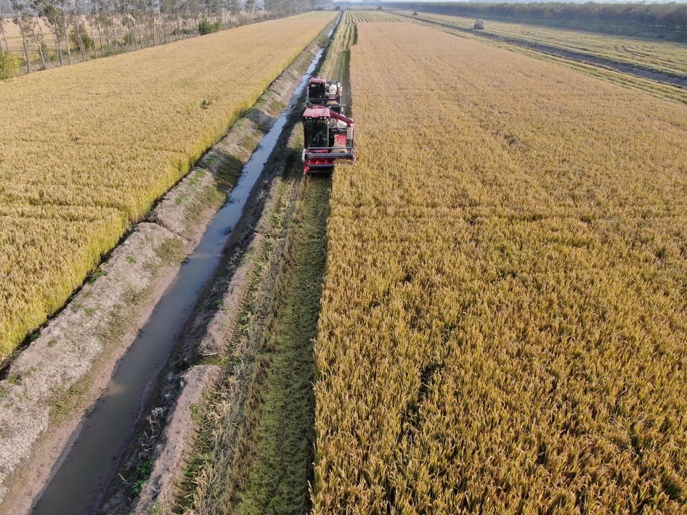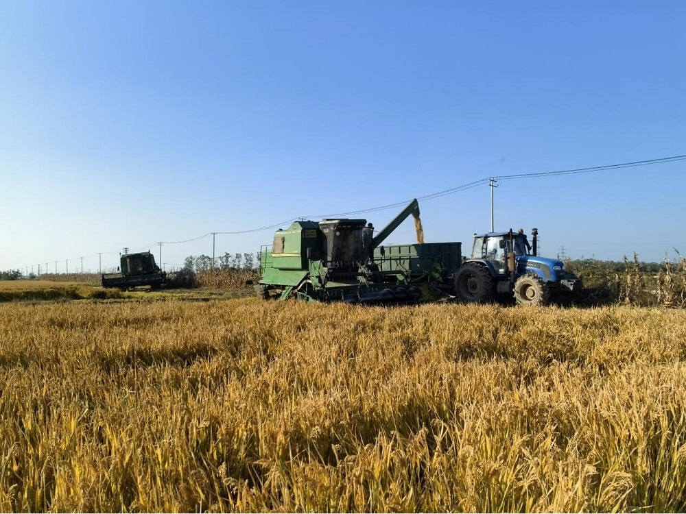 接連成片的稻田上,收割機(jī)馬力全開,運(yùn)糧車在田間有序穿梭,收割、脫粒、裝車一氣呵成。