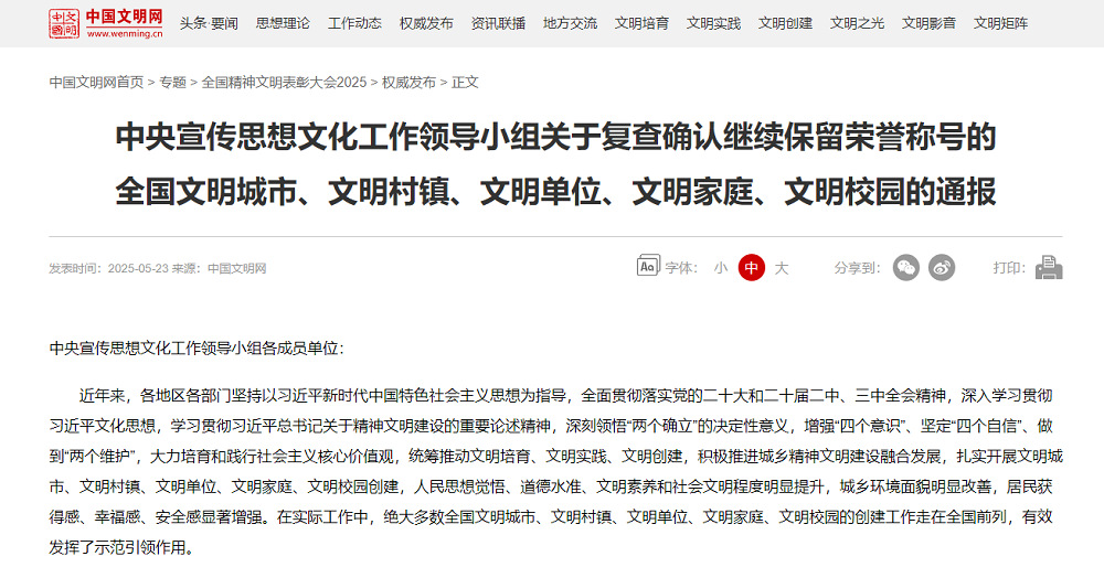 5月23日,中央宣傳思想文化工作領(lǐng)導(dǎo)小組公布《關(guān)于認(rèn)定命名第七屆全國文明城市、文明村鎮(zhèn)、文明單位和第三屆全國文明家庭、文明校園的決定》和《關(guān)于復(fù)查確認(rèn)繼續(xù)保留榮譽稱號的全國文明城市、文明村鎮(zhèn)、文明單位、文明家庭、文明校園的通報》。蘇墾農(nóng)發(fā)順利通過復(fù)查評估,繼續(xù)保留“全國文明單位”稱號,這是繼2020年首創(chuàng)首成第六屆“全國文明單位”后又一次獲此殊榮。