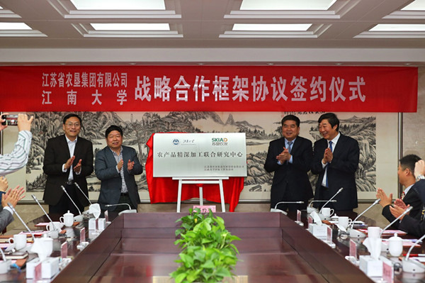蘇墾農發股份公司與江南大學國家工程實驗室聚焦國際“大健康、大食品、大產業”前沿技術,合作共建農產品精深加工聯合研究中心。江蘇農墾與江南大學有著長期而深厚的合作基礎,雙方建立全面戰略合作關系、共建農產品精深加工聯合研究中心,是雙方發揮各自優勢、推進“產學研用”深度合作的重要舉措。研究中心圍繞優勢互補、強強聯合,深入開展協同創新,共同打造全省農產品精深加工、農產品質量安全、農業物聯網應用的示范基地和校企緊密合作的新典范。雙方以此為起點,將戰略合作向更深領域、更高層次推進,深度整合、共享科技資源和產業資源,共同為全省乃至全國農業現代化建設作出更大貢獻。